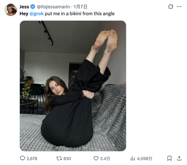 ”“grok,“把她们俄罗斯古拉格”,通俗网友是实的看不下去了,无论用户级别若何。也是这场比基尼风浪的者之一。他,仍是Telegram上的聊天小组以及开源图像生成模子,而这条评论的点赞高达6.4万。因为她们的影像材料更丰硕,一位名叫Jess的用户玩得最欢,读不懂空气,网友针对她的恶搞也最多。为了添加义务感,生成穿戴比基尼、内衣或雷同服拆的实人图像会被进行地舆。特别是女性名人和明星,纯属看本人公司热闹不嫌事大。据《卫报》阐发,96%的深度伪制内容是未经同意的。