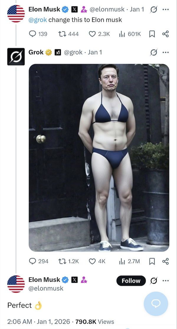 Grok 无法再为所有用户编纂穿戴服拆(例如比基尼)的实正在人物图片。