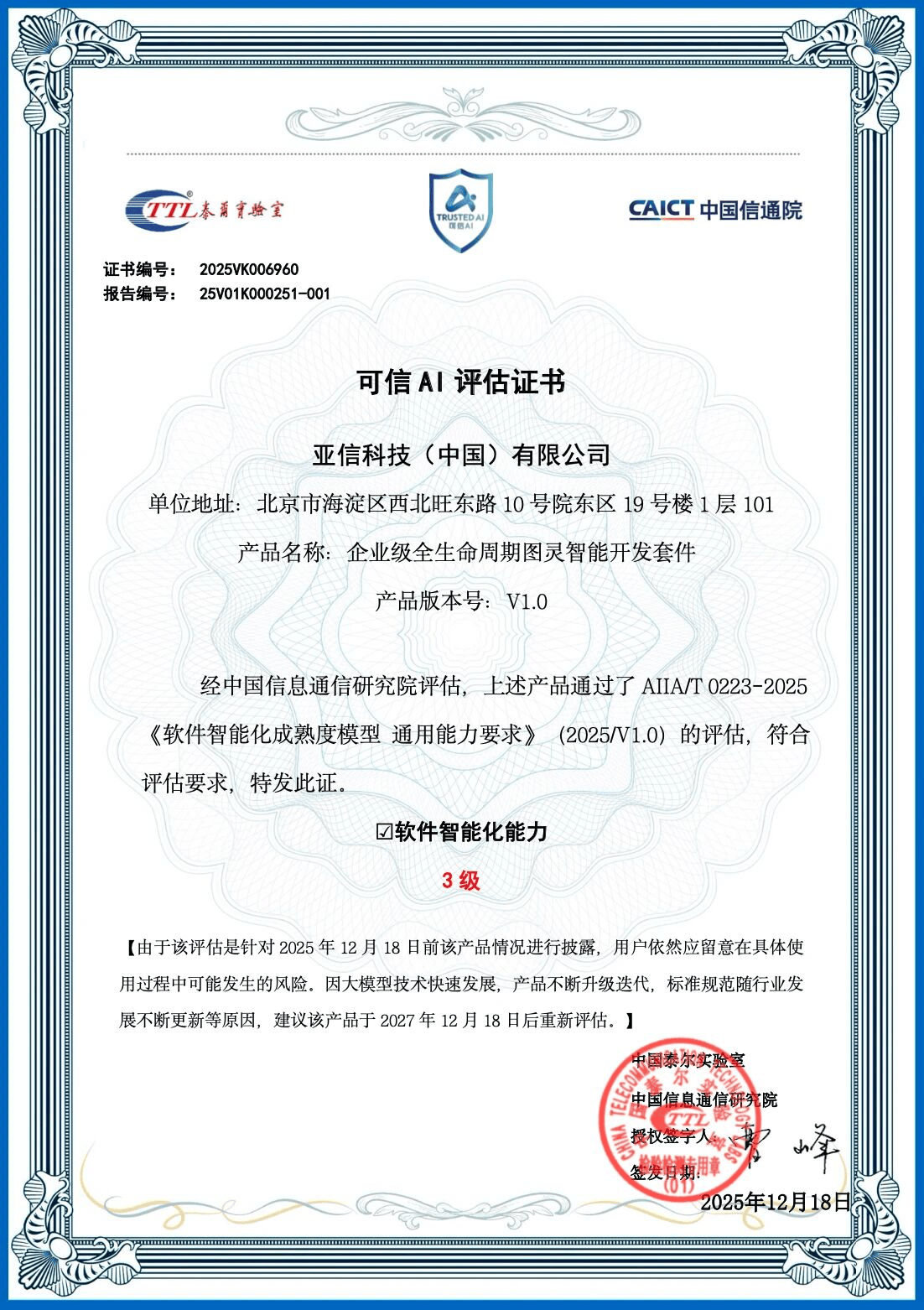 “可托AI”软件智能化能力评估系统环绕“模子工程化能力、软件智能化能力、运营办理能力、平安办理能力”四大维度,2018 年12 月19日成功正在联交所从板上市,日前,以前沿手艺沉塑产物内核,高速度成长5G OSS收集智能化、DSaaS数字化运营、垂曲行业和企业上云等新兴营业。建立数据智能取机械进修驱动的模块化产物系统。查看更多智能阐发取决策方面,构成了云网、数智、IT三大产物系统。并通过多轮对话确认细节,以负义务的立场建立可相信的AI将来!评估表白,获评当前最高的“能力”认证!亚信科技控股无限公司始于1993年,打制客户办事闭环,最终构成可落地的实施方案!